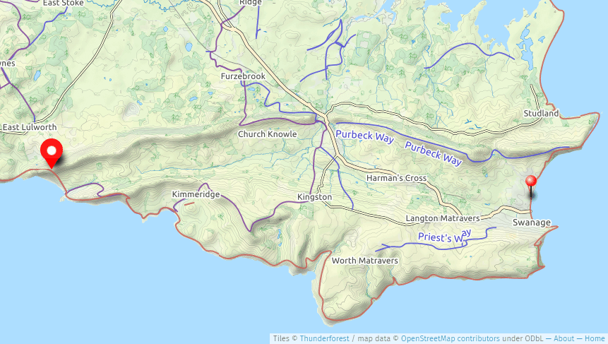 An exceptional circular walk from The White House (red pin on map) with spectacular panoramic views of the picturesque Isle of Purbeck and its coast. Following the South West Coast Path and the Purbeck Hills ridge, the route is effectively a combination of the Isle of Purbeck east and west circuits, which are in turn based on the recommended shorter walks from Swanage to Durlston, Durlston to Dancing Ledge, around St. Aldhelm’s Head, on to Kimmeridge then Tyneham before returning along the chalk ridge from Flower’s Barrow (red marker on map) to Corfe Castle and finally the Purbeck Way back to Swanage.