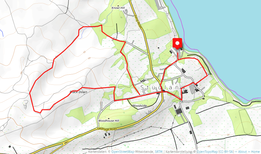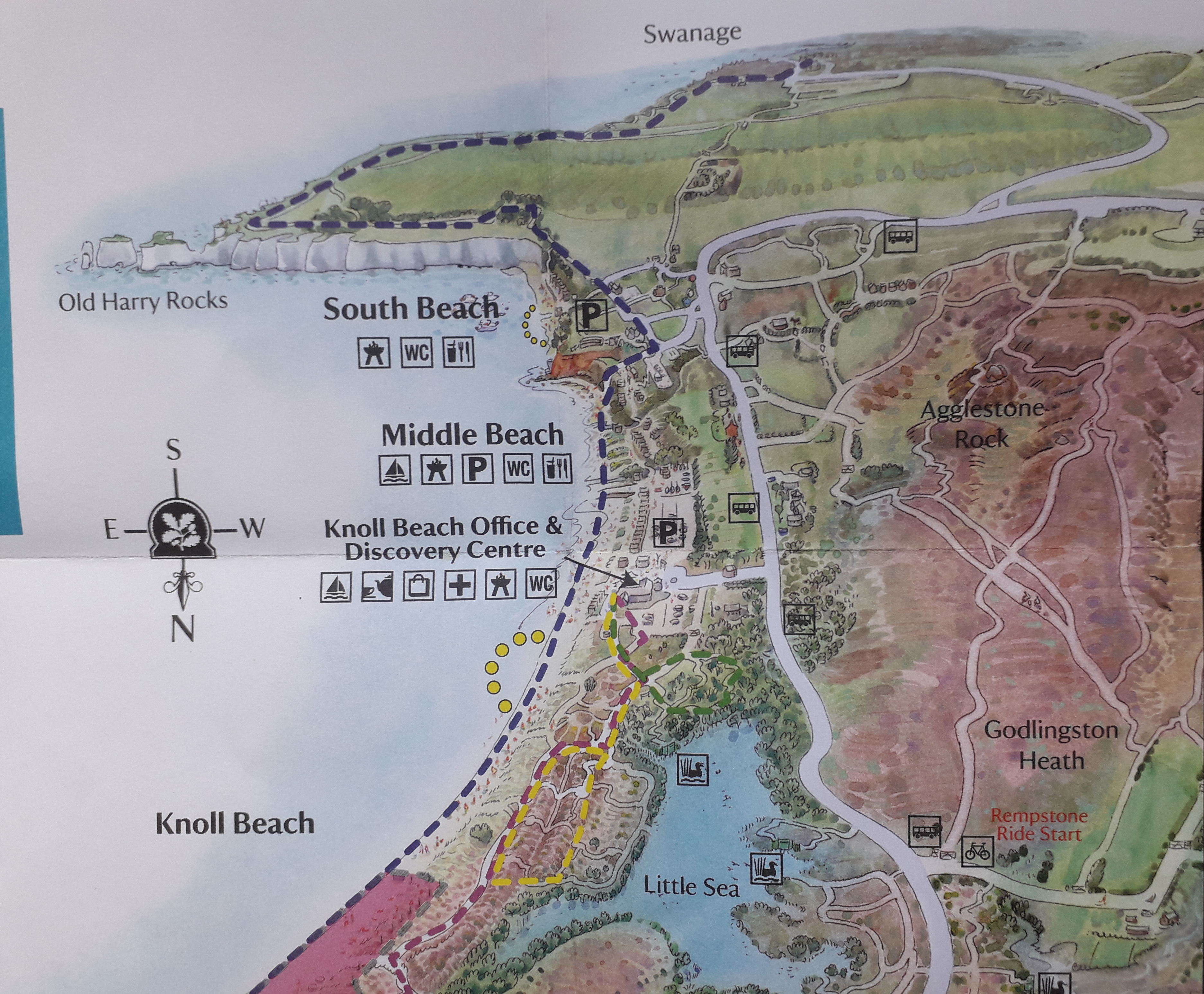 A short rainy day option that highlights the historical role Studland Bay played in WWII followed by a walk across a section of Godlingston Heath to the distinctive Agglestone Rock. Drive to Studland village and turn off Ferry Rd onto Beach Rd, heading for the Middle Beach National Trust car park (red marker on map). Walk back to the car park entrance and take the South West Coast Path to the left of the thatched cottages that runs along the low cliff top and behind The Pig on the Beach restaurant. Shortly you will come across a large concrete structure called Fort Henry. This observation post was used as a secure location from where King George VI, Churchill, Eisenhower and Montgomery observed the live-firing D-Day landing exercise in April 1944. To the right of the observation bunker is a memorial to the men who drowned during the exercise in the trial of the floating Valentine tanks. Continue along the footpath, turning inland to cross Manor Rd and take the footpath that runs to the right of the NT South Beach car park and through the churchyard of St. Nicholas. Passing around the 1,000 year old church exit onto Church Rd and at the Celtic Cross turn right up School Lane. At the crossroads by the Studland Stores, go straight across and follow Heath Green Rd (note passing the track for your return) until you reach Agglestone Rd where you turn right and follow the track around and behind the houses. The gate on the right at the end of the track and houses brings you onto Godlingston Heath.