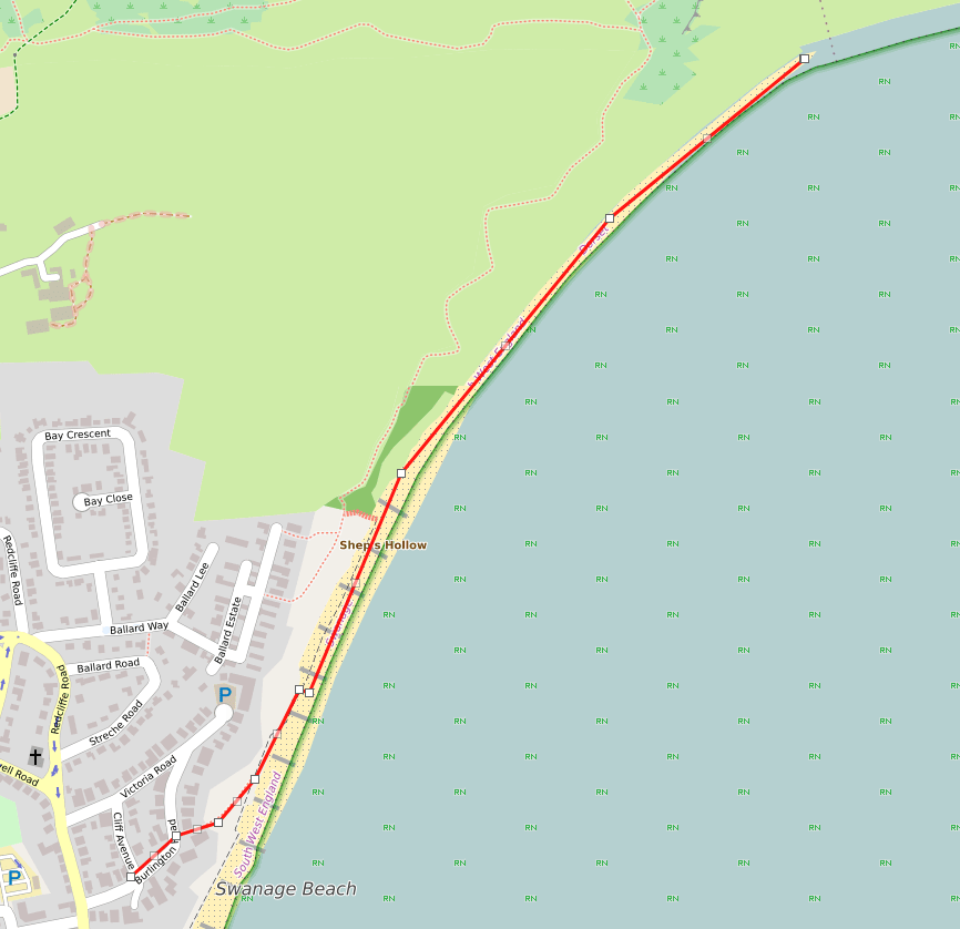 [Note there are two alternative routes off the beach that take you up onto the South West Coast Path. The first is a set of steps at Shep’s Hollow by the end groyne that have recently been repaired and opened (November 2024) following a previous storm. When open this route enables you to either join the footpath to Ballard Down (see Swanage to Studland walk) or return, left, in the direction of the town. The second route is a well hidden track cut through the trees and bushes in a depression towards the end of the beach, before you reach the large pile of chalk stones. However a large landslip in the summer 2021 has destroyed the larger of the two access points. Note that having found the narrow second entrance, the route is steep and muddy in places where locals have cut footholds into the ground and provided tethered ropes to help you negotiate your way up the path. User discretion is thus recommended!]