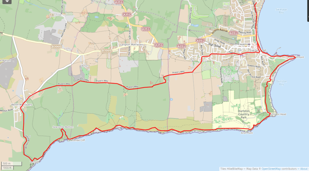 An excellent day walk with fine cliff top views and an opportunity for a lunch stop (pint and a pasty) at the popular Square and Compass pub or your packed lunch at one of the numerous rocky bays or cliff tops along the way. This route combines three of the described walks – Swanage to Durlston, Durlston to Dancing Ledge and Worth Matravers (short) [Note to extend the walk further, instead of heading inland at Winspit to Worth Matravers, continue on the South West Coast Path via the St. Aldhelm’s Head walk, heading inland to Worth Matravers via the Renscombe Farm car park].